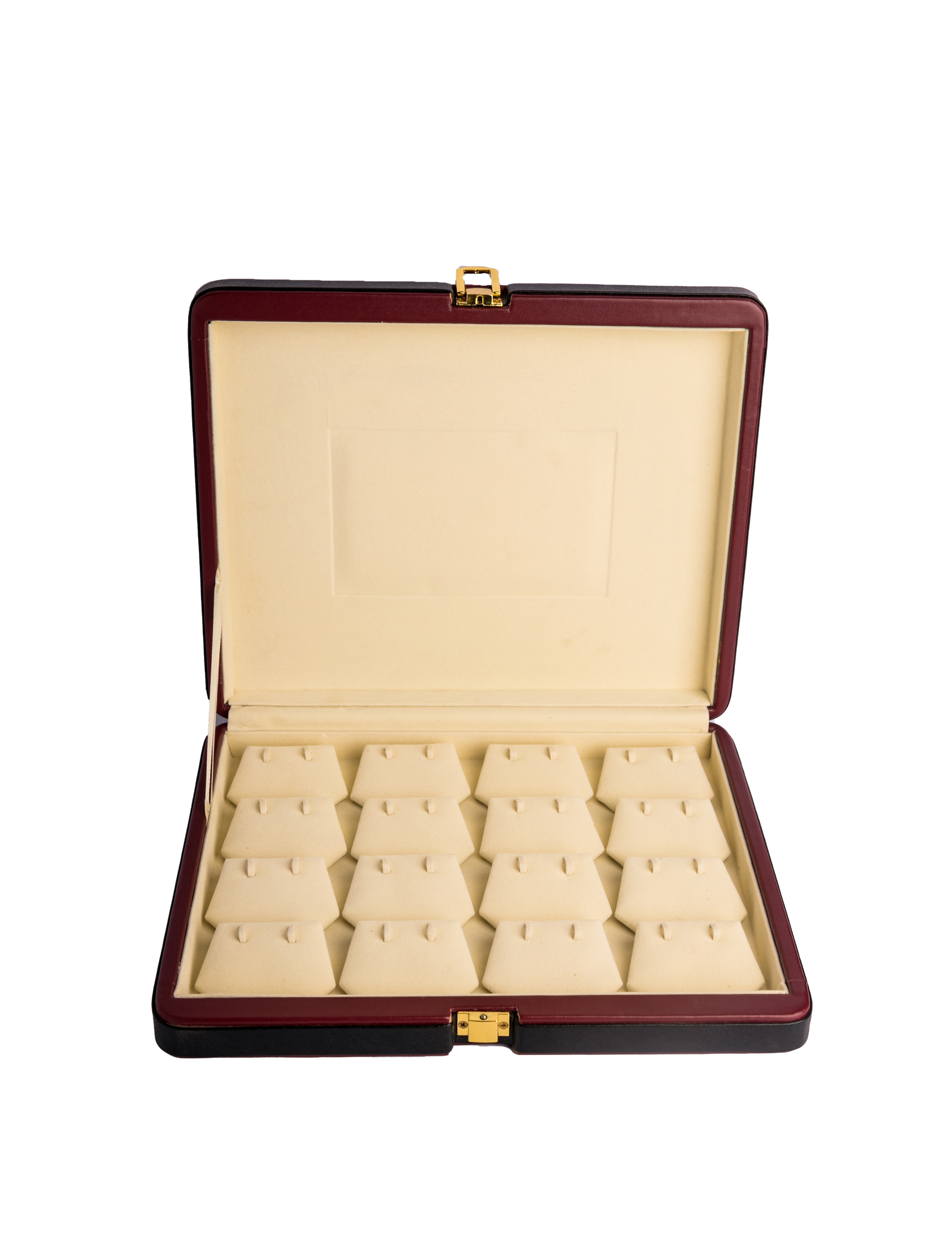 The 16 Bali Box is perfect for storing 16 elegant eardrops. Crafted with a maroon rexene exterior and a cream suede interior, it provides a luxurious yet practical solution for your jewelry needs. The golden clip lock ensures safety and style in one compact design.
