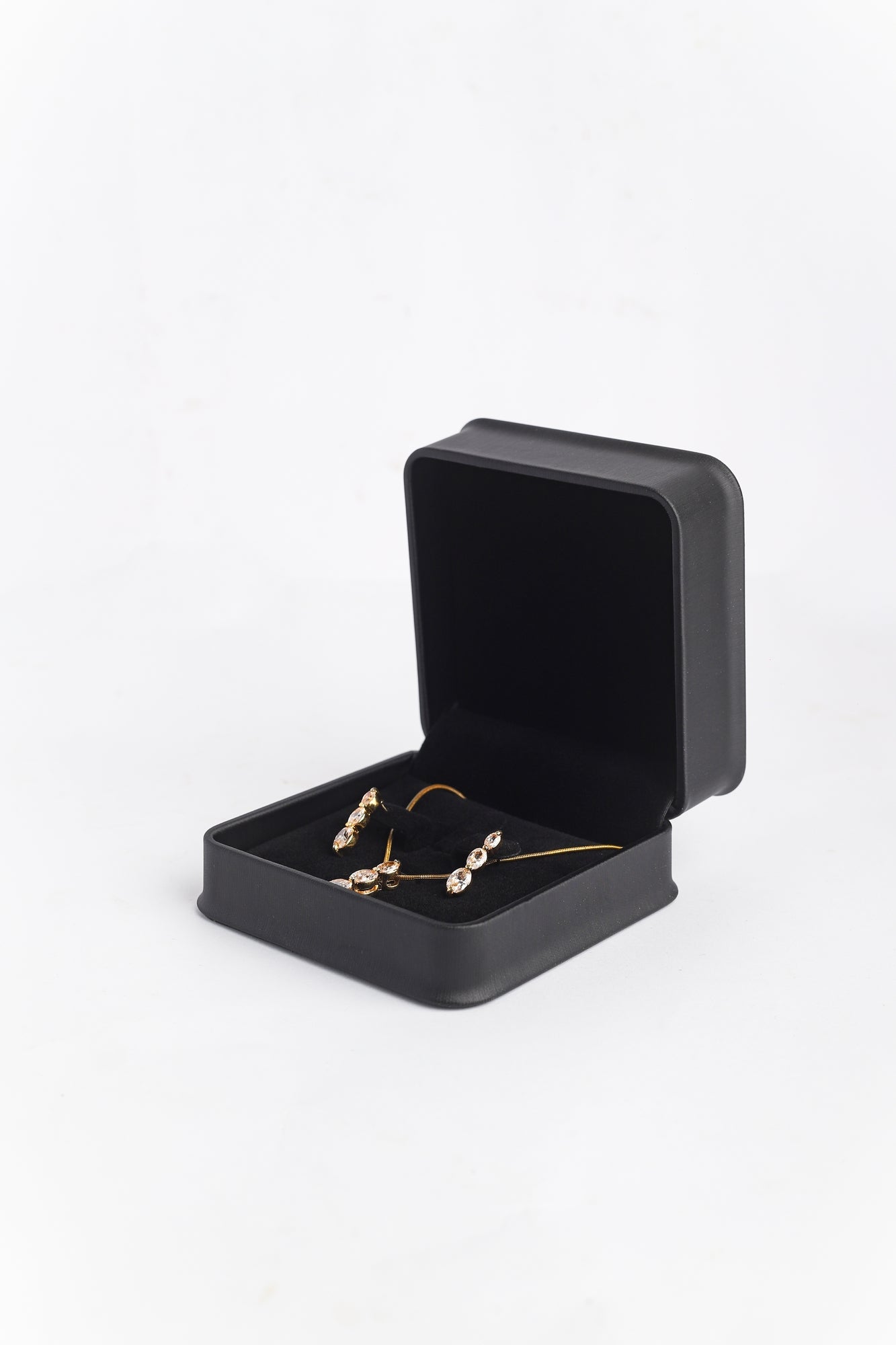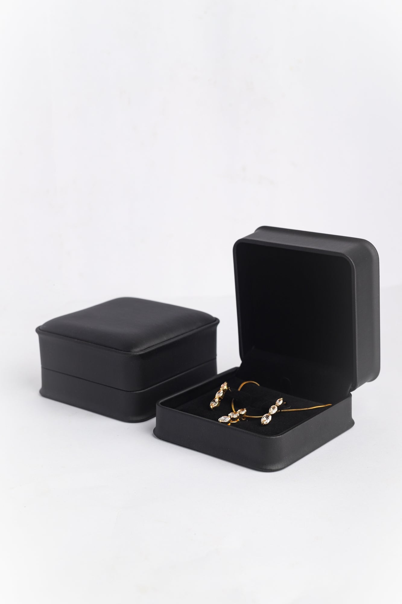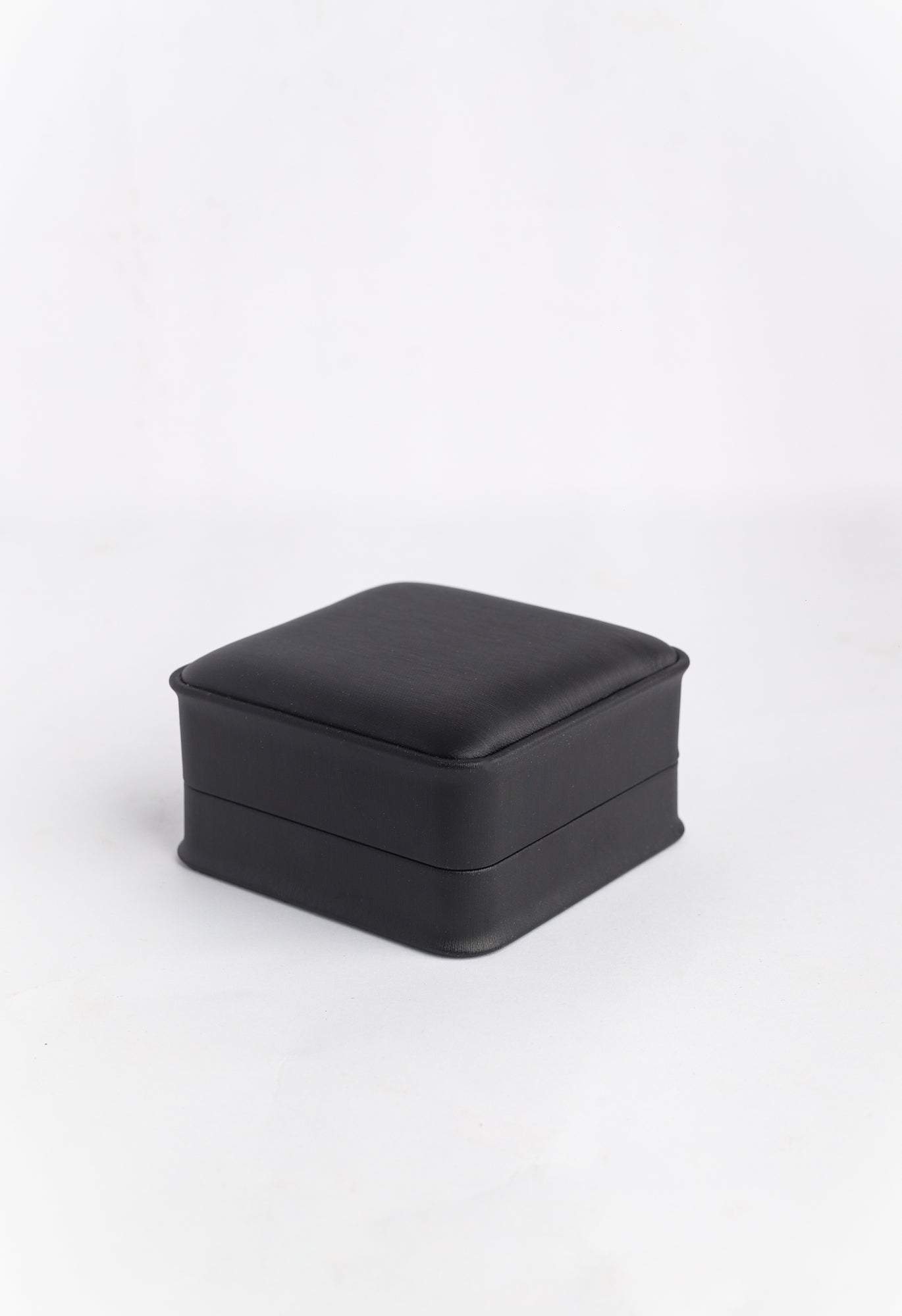 Introducing the Locket Set Box 4 x 4 LC, a refined jewelry box from the "Leather C" collection designed to hold a locket with a chain, a ring, and a pair of earrings. The black rexine exterior pairs beautifully with the rich black velvet interior, ensuring your jewelry is securely stored and elegantly presented. This imported box is perfect for organizing and showcasing your complete set with sophistication and style.