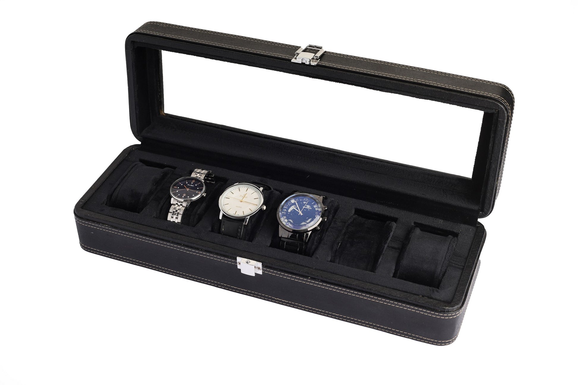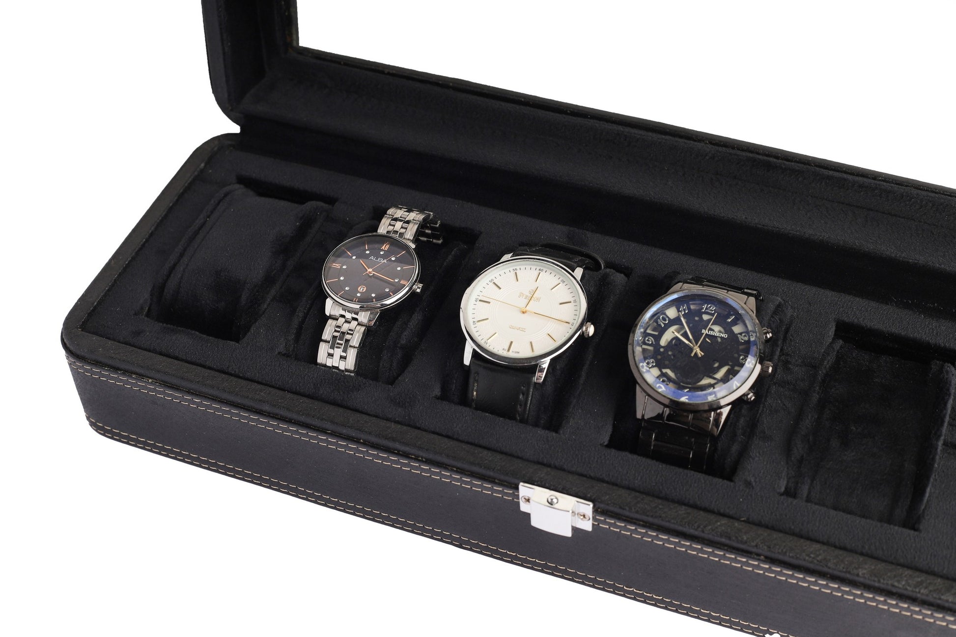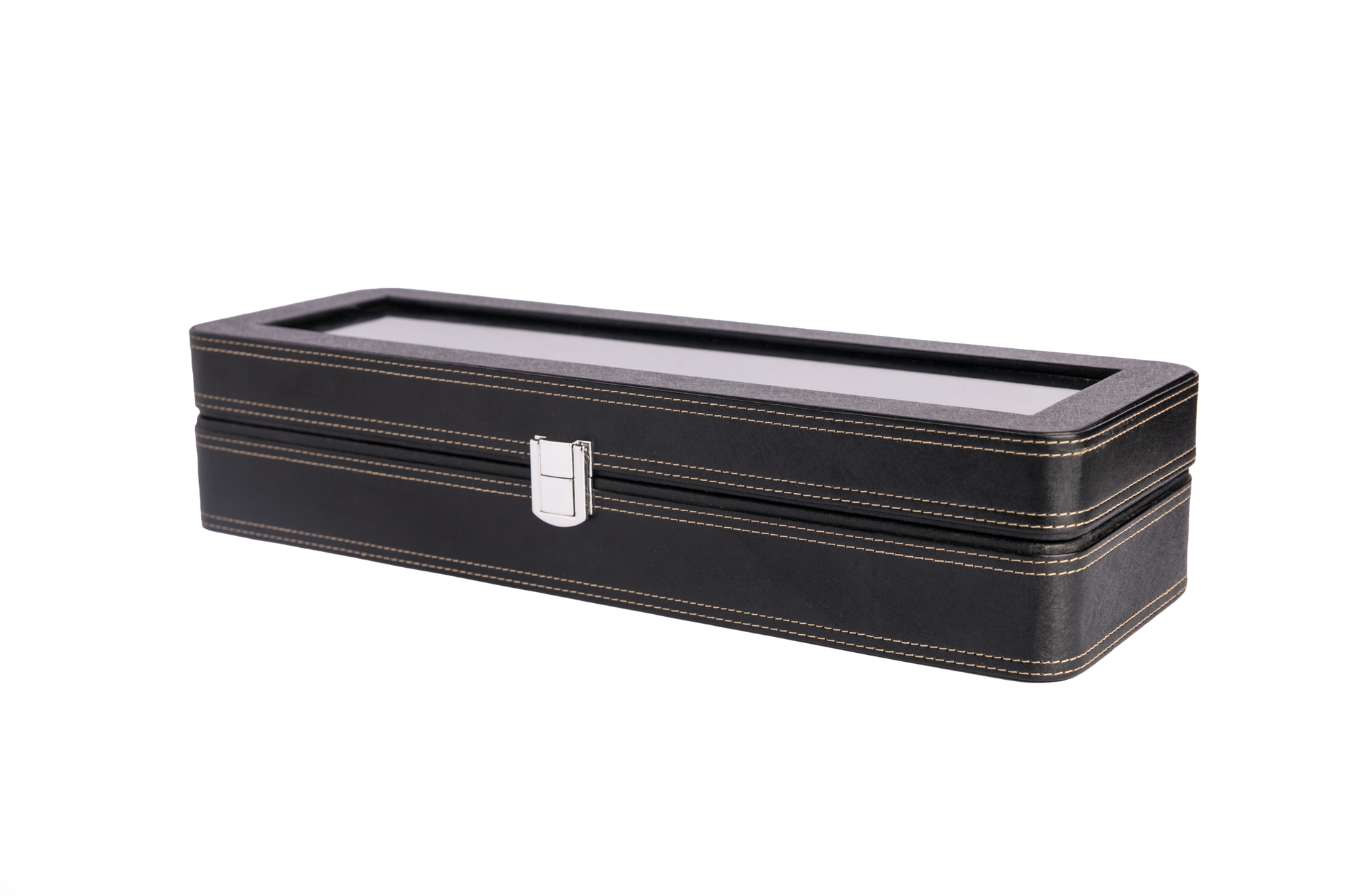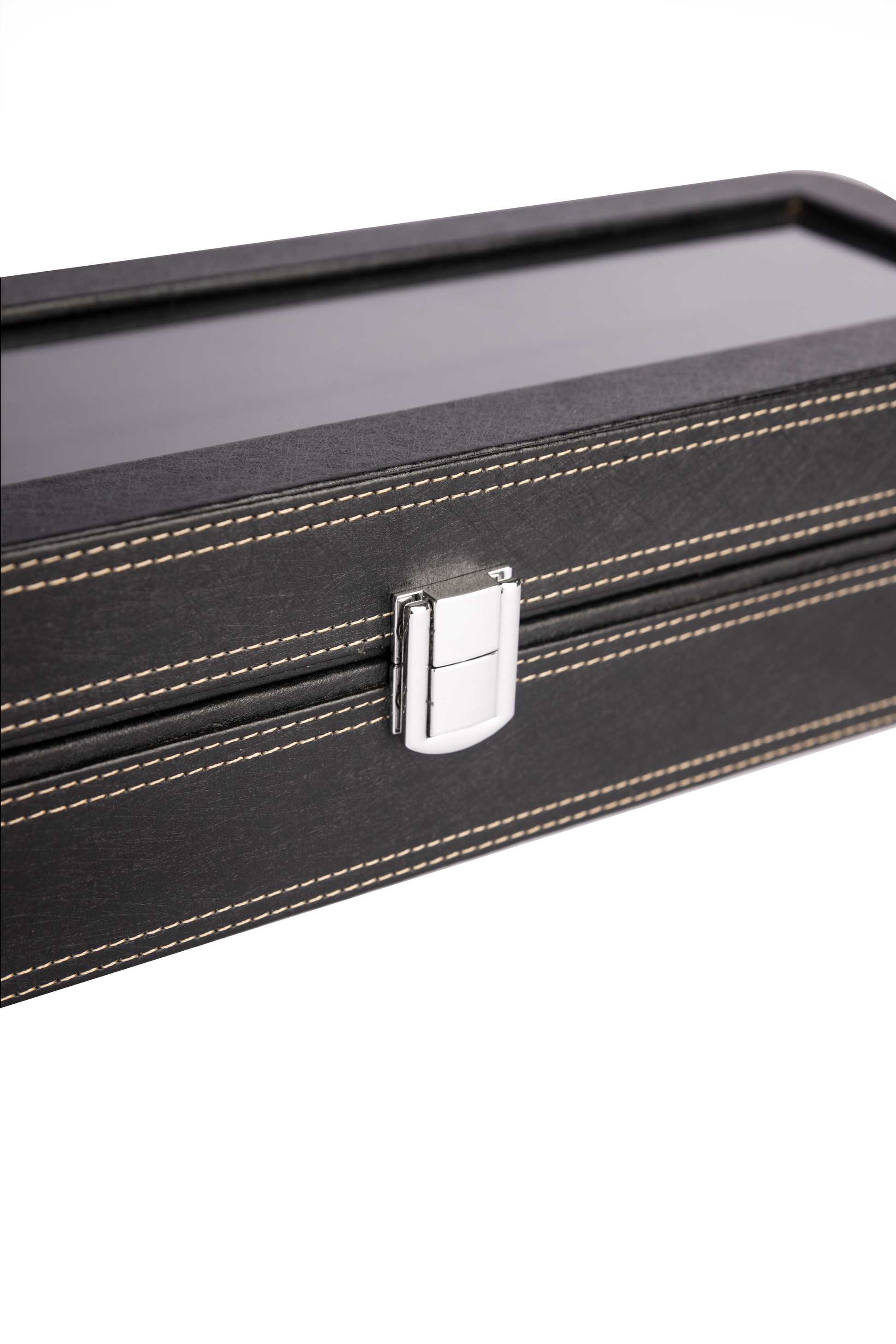 Elegant and practical, the 6 Watches Box is the perfect organizer for your prized watch collection. Featuring a luxurious malai velvet interior, it ensures each watch is nestled safely in its own slot, protected from scratches and dust. The exterior is crafted with high-quality rexene, detailed with contrasting white stitching on the borders, adding a refined touch. A transparent glass top allows you to display your watches stylishly while keeping them secure. The box is finished with a durable silver clip lock on the front for added safety. Available in classic black with a customizable design option for a personalized touch, this box is ideal for showcasing and protecting your collection.